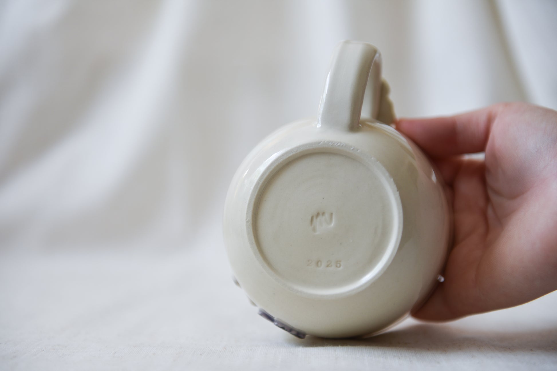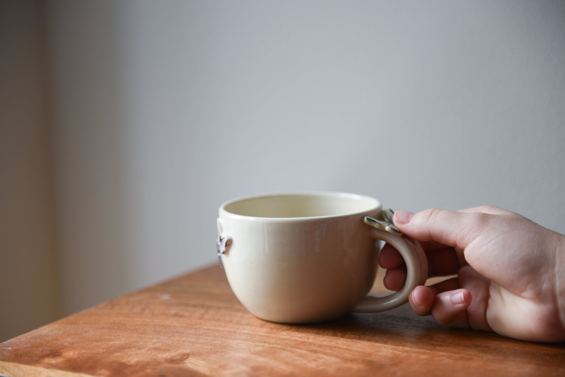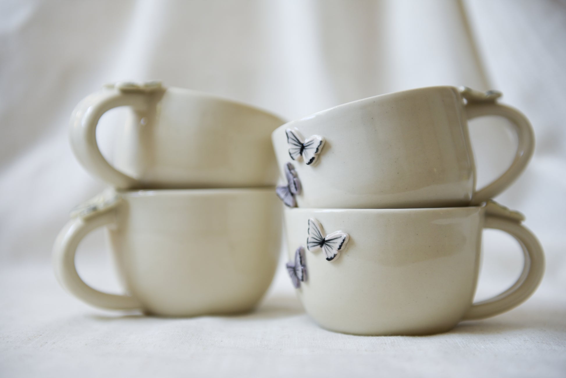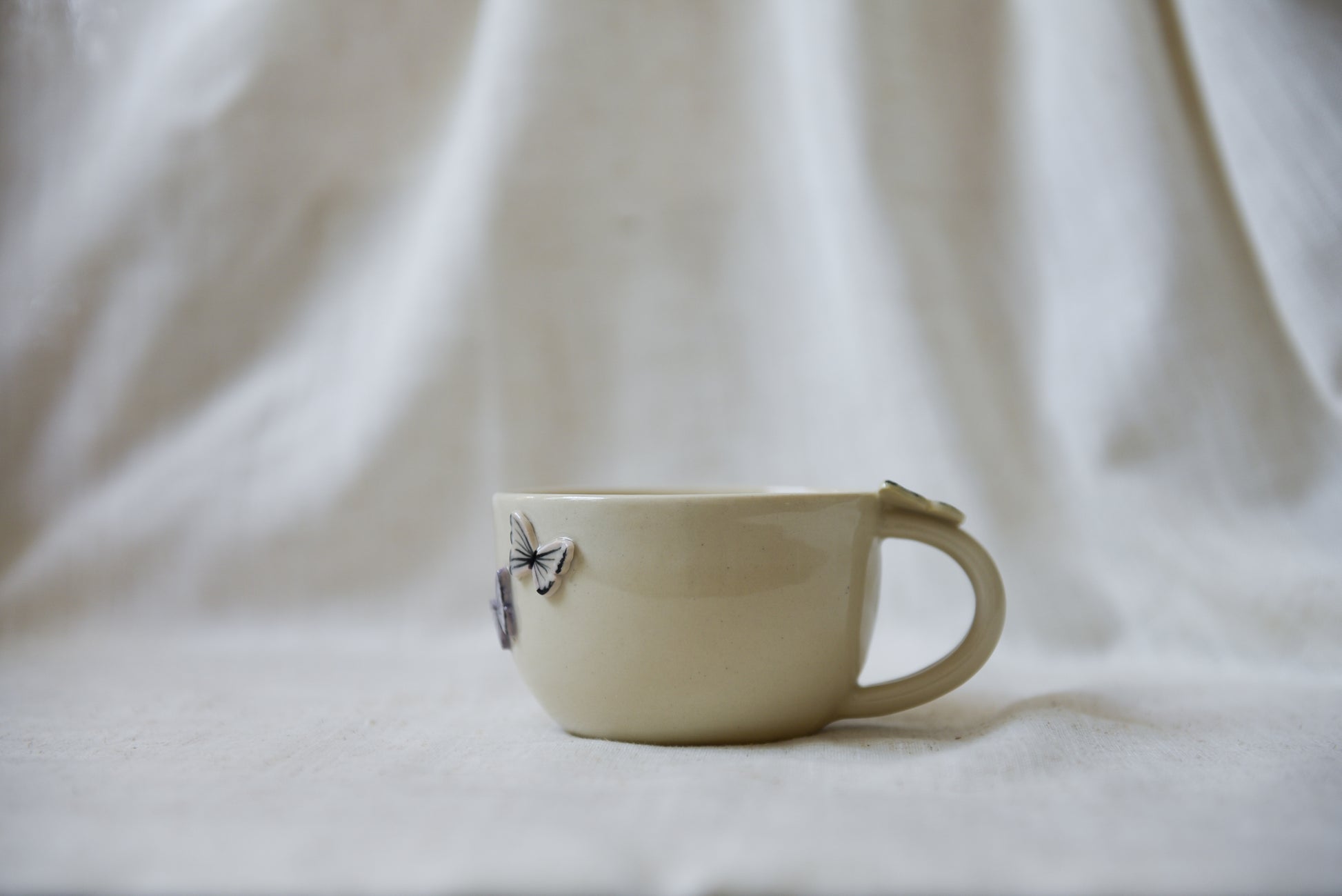 This lovely butterfly latte mug is wheel-thrown using a sturdy stoneware clay and coated in a lead-free glaze. All details are hand painted.