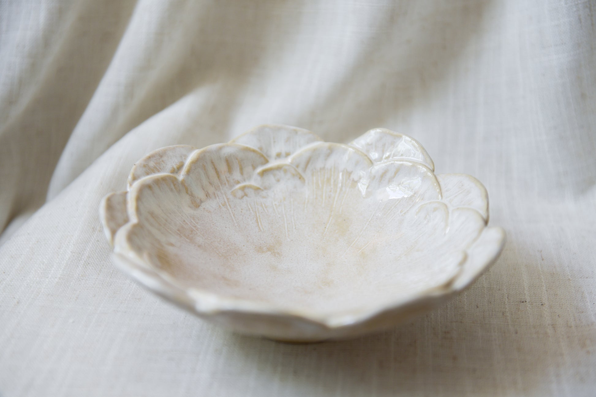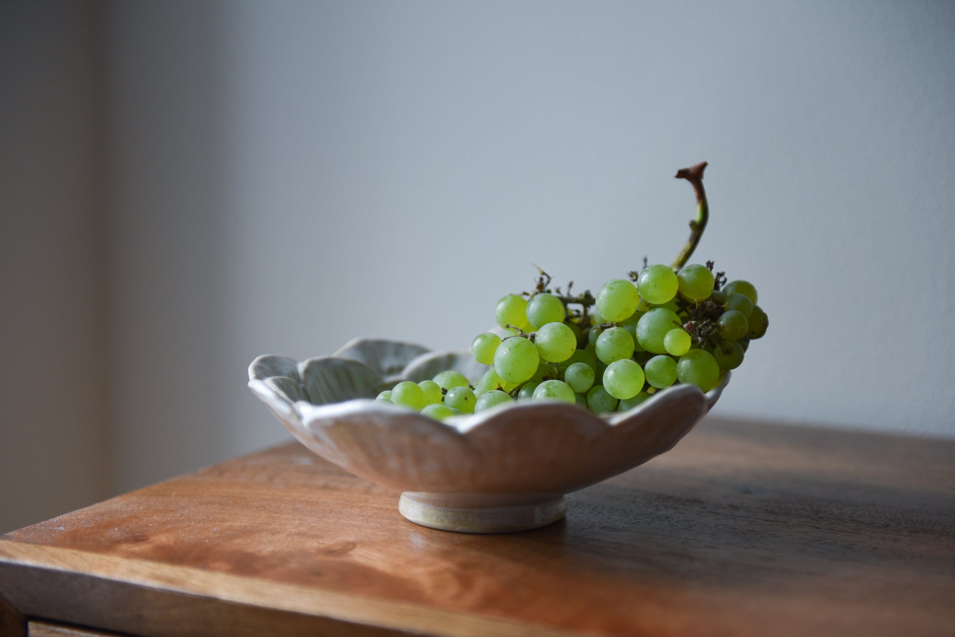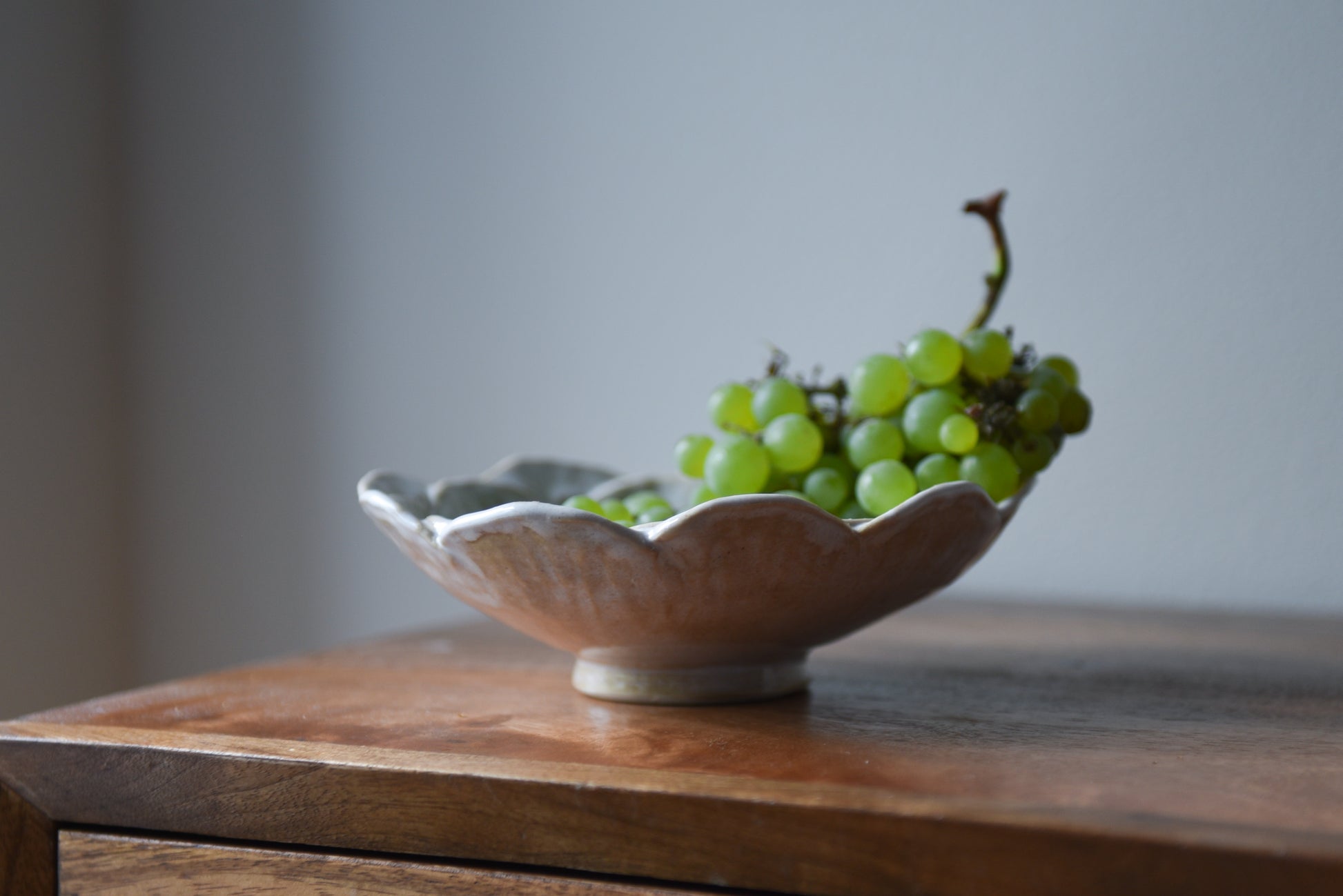 The small fruit bowl was hand built using a high quality stoneware clay and glazed with a lead-free glaze. The surface texture was hand shated, giving the bowl an organic appearance.