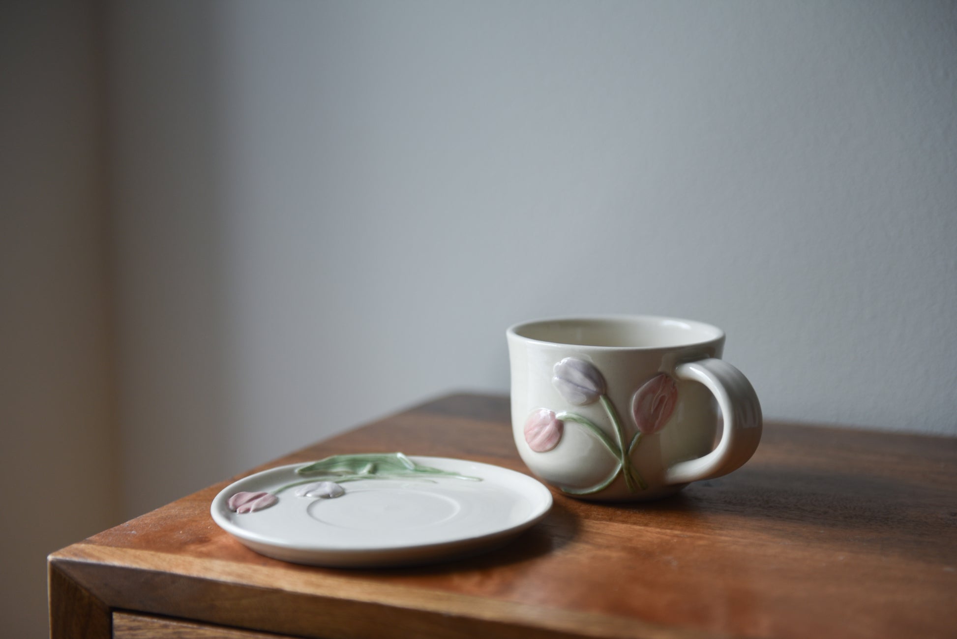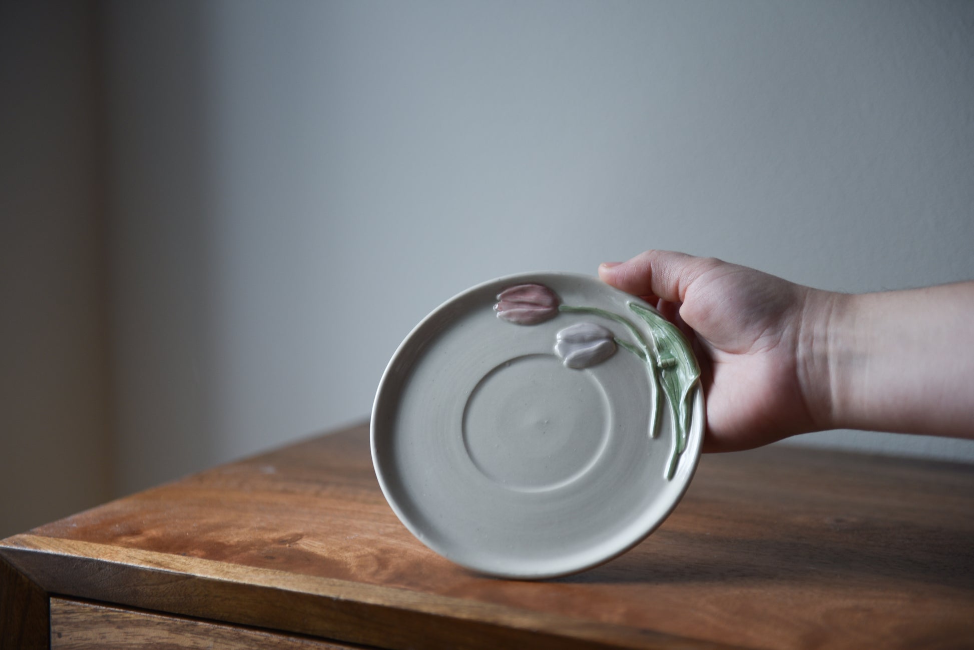 This lovely tulip plate was wheel thrown using a stoneware clay and glazed with a lead-free glaze. All details were hand painted. Mug not included with purchase.